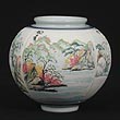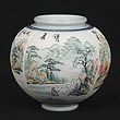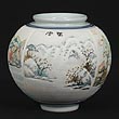 Attractive round white porcelain jar has four distinct hand-painted pictures featuring Korean country scenes in the summer, fall, winter, and spring. Style WPJ005