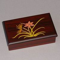 Lacquered wood box with flowering wild orchids, one of the Four Gracious Plants, and a red felt interior. Style LBX105