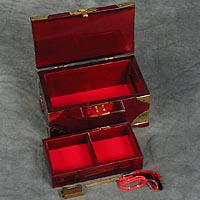 Beautiful wood jewelry box has a richly finished wood exterior with brass trim. Inside it has a removable tray for jewelry or knick knacks. Comes with a Korean antique style