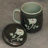 Handsome celadon mug with a rich dark glaze surrounding an inlaid peony design on the mug and the lid. Style CS016