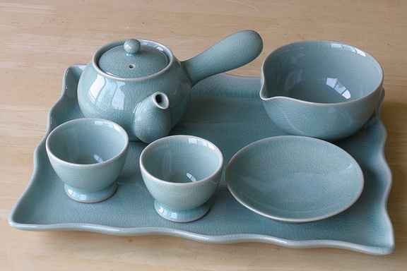 Traditional Korea style teapot, two cups, cooling bowl, utensil saucer and optional serving tray in Mu-ji, plain celadon, with its delicate crazing (pattern of surface cracks) which epitomizes the quiet, elegant beauty of Korean celadon pottery. Available with or without the serving tray. Style PS202